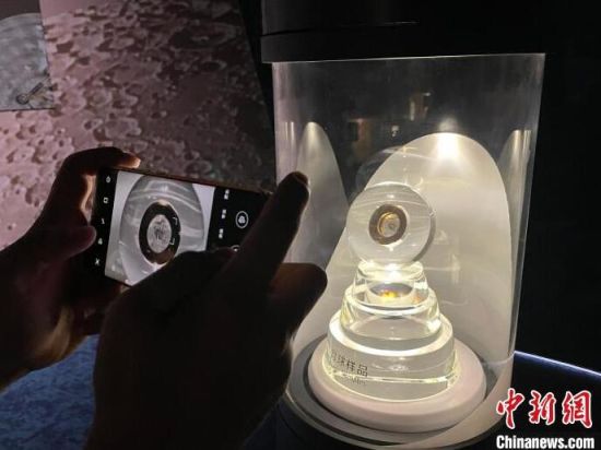2021年7月17日,全球建筑規(guī)模最大的天文館——上海天文館開館。當(dāng)天的開館儀式上,與會(huì)嘉賓為“天外來物”——月壤入館揭幕。該部分月壤樣品被封裝在水晶球中,供觀眾近距離觀看。(資料圖) 中新社記者 鄭瑩瑩 攝