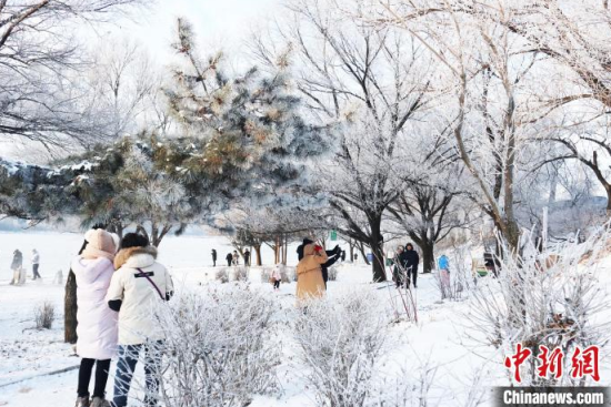 12月1日,吉林省吉林市,游人在“小霧凇島”上觀賞霧凇景觀。中新社記者 蒼雁 攝