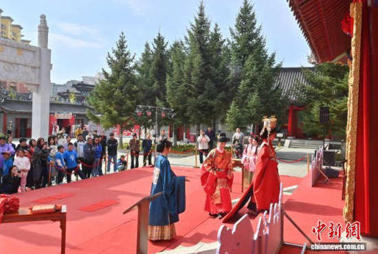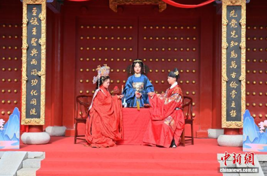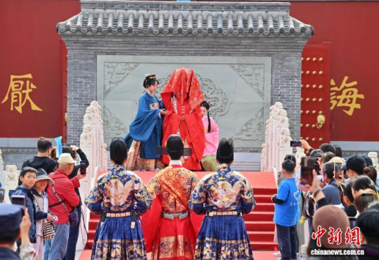 10月7日,吉林長春文廟舉行了一場明制漢婚沉浸式展演。漢服愛好者依次呈現(xiàn)奠雁、同牢、合巹等傳統(tǒng)禮儀,生動(dòng)還原明代婚俗,F(xiàn)場通過流程講解與道具展示,解讀禮儀背后古人對(duì)婚姻與美好生活的寄愿。中新社記者 張瑤 攝