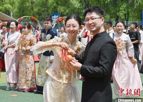 6月21日,吉林大學(xué)中心校區(qū)舉行2025年校友集體婚禮,36對新人從四面八方相聚在母校,在眾人矚目下有序步入婚禮主舞臺,沿途得到學(xué)弟學(xué)妹們的熱情祝福。中新社記者 張瑤 攝